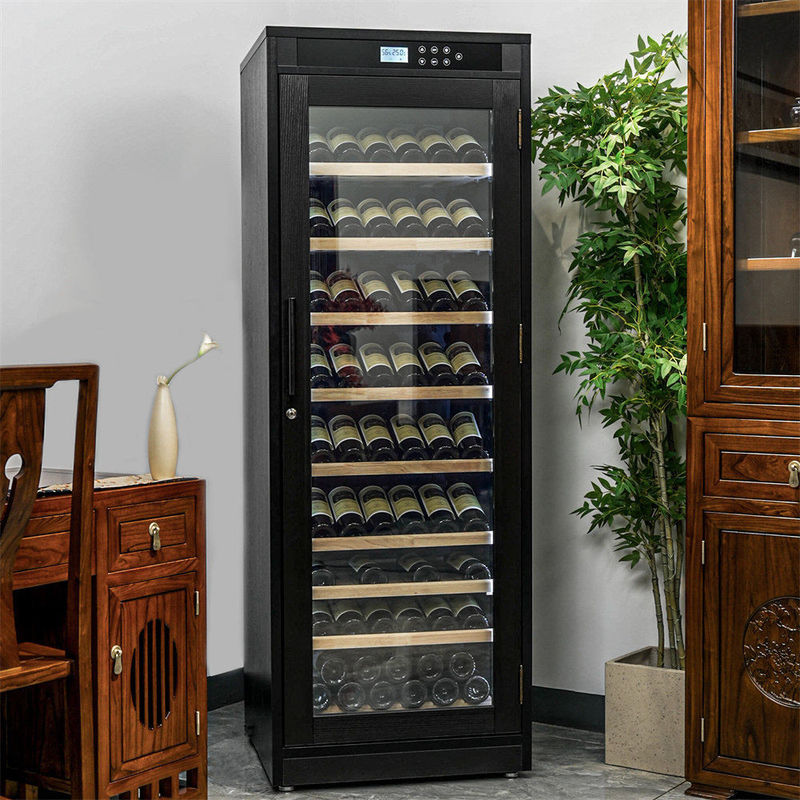 Desfrute da sua paixão pelo vinho com o nosso requintado refrigerador de vinho de madeira preta, com temperatura controlada, meticulosamente concebido para a perfeição.Este refrigerador de vinho combina tecnologia de última geração com elegância atemporal., oferecendo a solução definitiva para os entusiastas do vinho armazenarem e preservarem as suas preciosas coleções de vinhos.