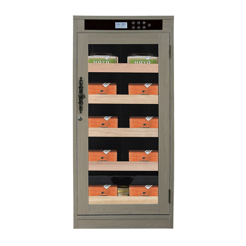 Apresentando um refinado acabamento em madeira cinza que exala luxo e sofisticação, este armário Refrigerador Umidificador de Charutos combina estética moderna com apelo atemporal. O design elegante inclui uma porta de vidro transparente que exibe elegantemente sua coleção premium de charutos, mantendo condições ideais de armazenamento. O elegante painel de controle digital na parte superior fornece monitoramento em tempo real dos níveis de umidade e temperatura, garantindo controle ambiental preciso para seus charutos.